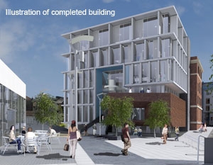 The Post Office will remain unchanged, in full operation on the ground floor of the building. The architecturally-notable façade will be cleaned and repaired. To create the new teaching premises, the vacant upper floors will be renovated and high quality new construction will replace the demolished rear extension, forming three sides around a central atrium. Illustrations are available.
